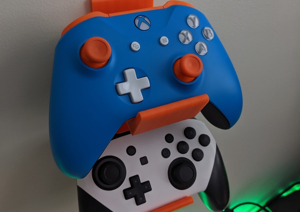 With this PLA wall mount, you can hang two controllers. It can be attached to a wall with an adhesive strip or via holes for pushpins underneath each controller hanger.