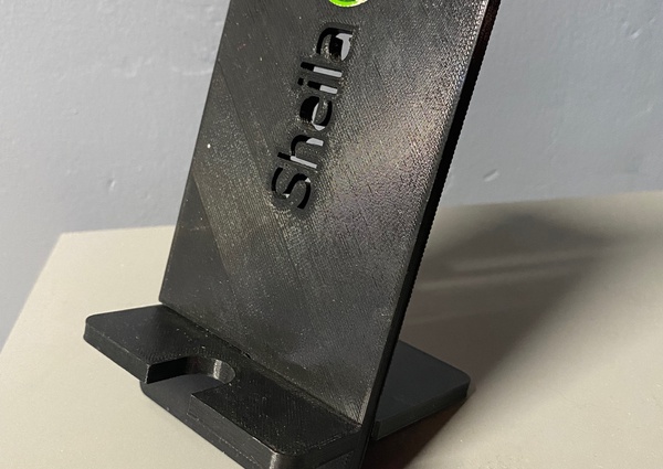A phone holder with cutout for cable and a custom name printed into it.