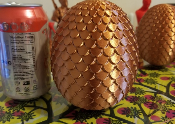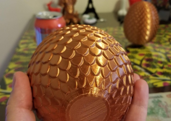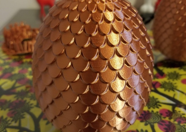 5 inch tall dragon egg, inspired by Game of Thrones. I can print it in copper PLA, it comes out very shiny and nice. Flat on the bottom so it sits on a table.