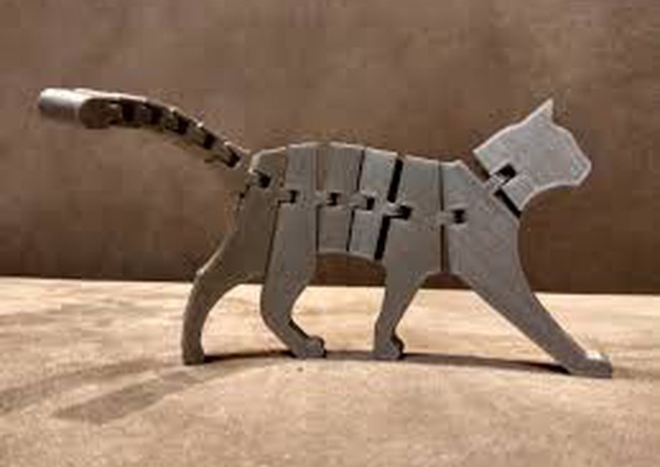 Standing cat that folds side ways only and is about 3 an a half inches long, 1 and a half wide and 2 in height.