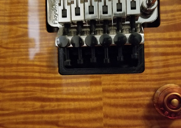 I designed this when I wanted to restring my Floyd Rose equipped guitar. It supports the bridge allowing you to remove all the strings at once while restringing/setting up guitar. Also improves tuning stability when playing and is nearly invisible.