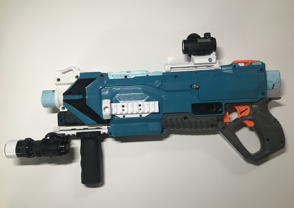 A slide on friction fit rail adapter customized to fit the bottom rail on a Nerf Modulus Regulator. Allows 9 slots of picatinny rail to be mounted. Drill holes and screw into the blaster rail as desired.