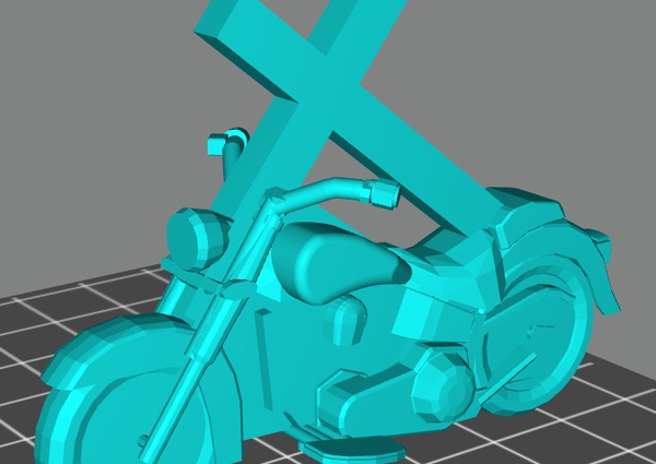 Model of a standard motorcycle with a Christian cross connecting the seat and handlebars. About 7cm long.