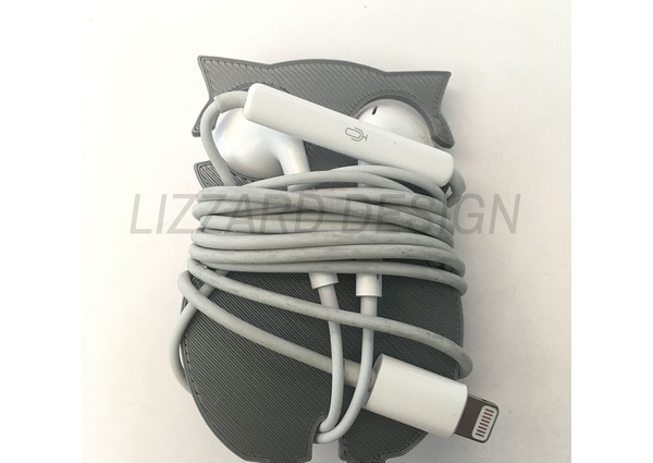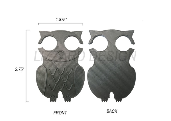 This owl cord wrap is made from PLA plastic and is about 2.75" x 1.875". It is between 1/16" and 1/8" thick.