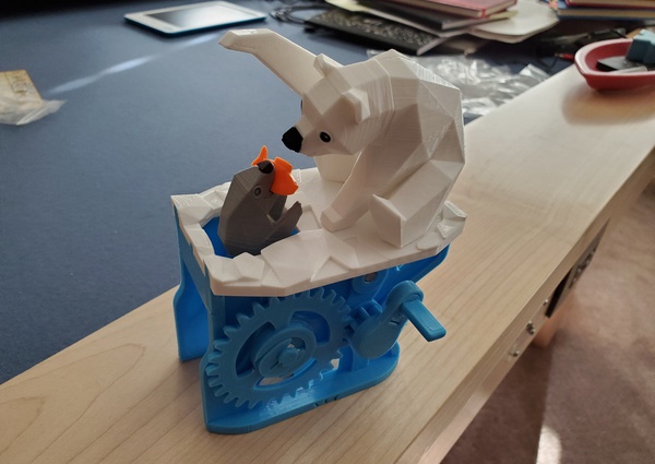 A hungry polar bear fails to reach the fish held in the naughty seal’s mouth. Every time the polar bear tries to catch the fish, the seal will sink back into the water and tease the poor, hungry polar bear.