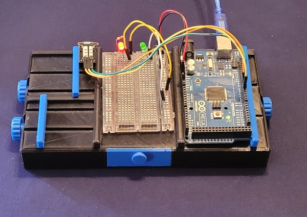Working with prototyping boards can be a mess. Your neat project will turn into a mess of wires extremely quickly, especially if you leave it on the shelf over night. This prototyping platform features three vices to hold your micro controller and your breakout boards. Store the components that you are not using in the drawer to keep things tidy. Wire your LEDs, resistors and ICs on the breadboard just as you would normally... except without the mess!