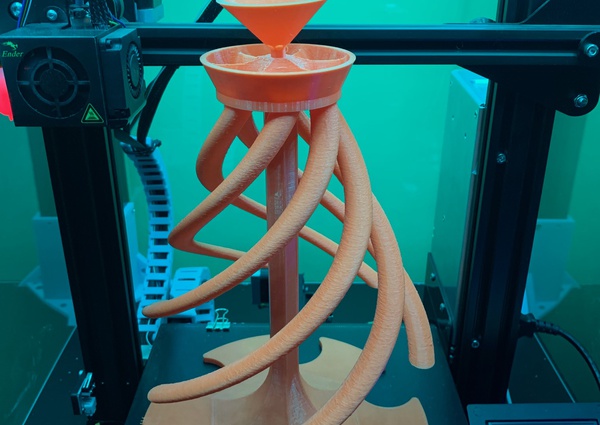 Evenly distributes 6 shots. Very challenging print. Functions okay, but more of a piece of art.